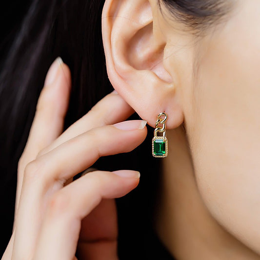 14K Gold Rectangular Emerald Twisted Cuban Chain Earrings(Pair)