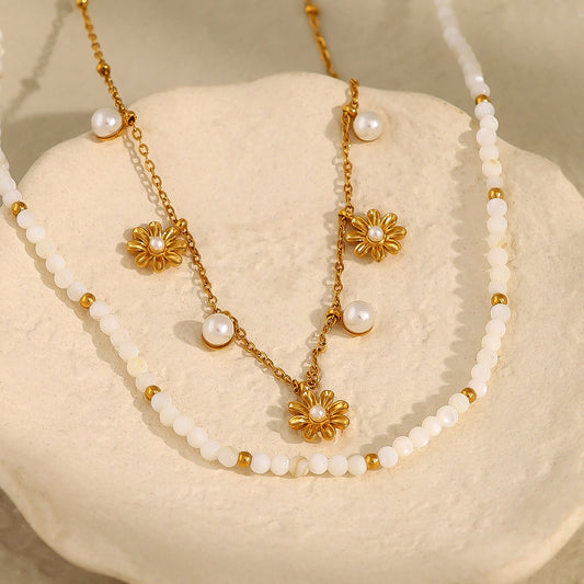 18K Gold Plated Titanium Steel Pearl & Shell Beaded Flower Pendant Necklace | Elegant Fashion Jewelry