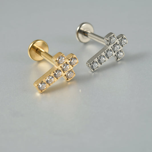 Cross zircon threadless flatback ear stud labrets