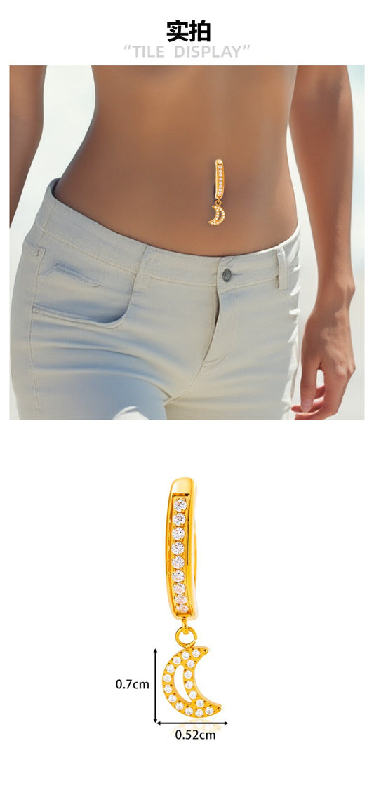 G23/F136 Titanium Moon Belly Button Ring – Zircon Hollow Crescent Dangle Navel Piercing Jewelry | Hypoallergenic Titanium Navel Barbell in Gold & Silver