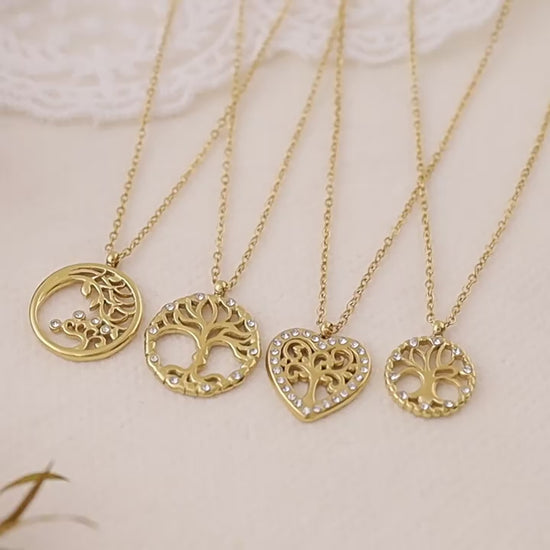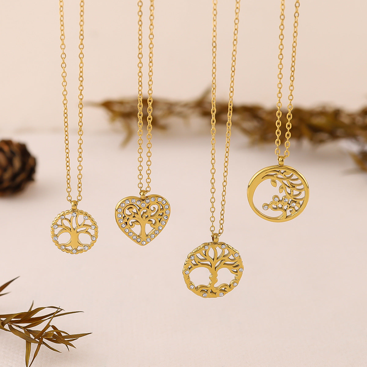 This 18K gold plated stainless steel necklace collection features delicate heart-shaped and circular crystal pendants, crafted for those who love subtle luxury and refined shine.