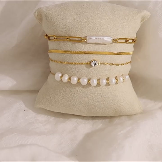 Elevate your daily elegance with our 18K Gold Plated Stainless Steel Pearl Bracelet Collection.