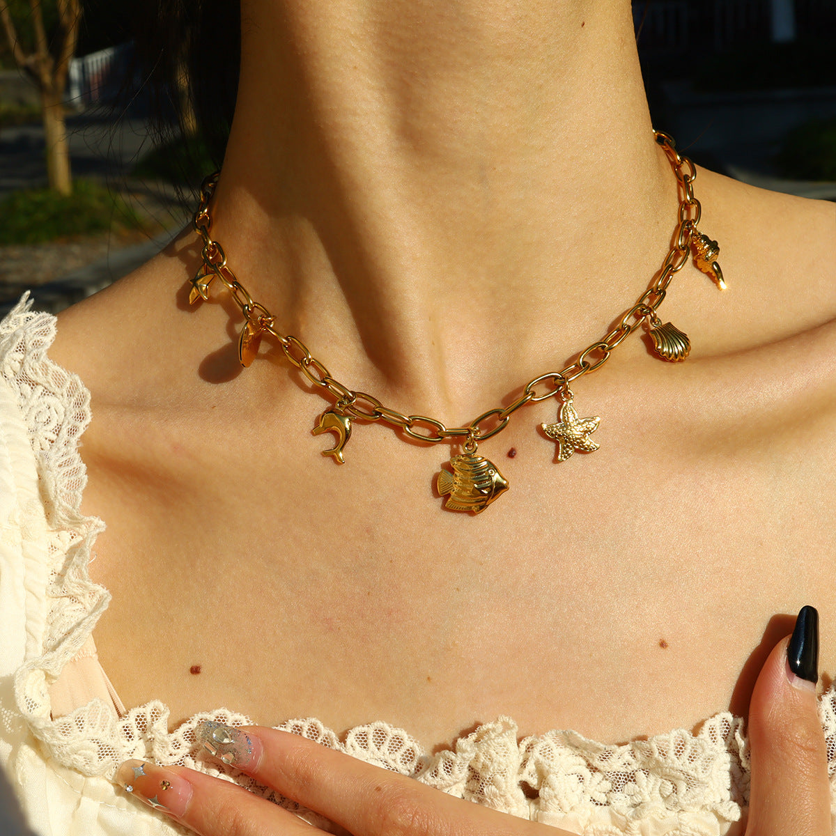 18K Gold Plated Titanium Steel Ocean-Inspired Starfish, Fish, Dolphin, Shell Pendant Necklace | Trendy Beach Jewelry