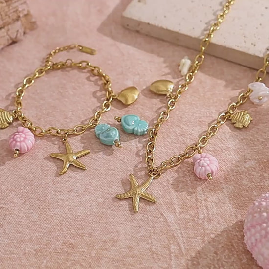 18K Gold Plated Stainless Steel Creative Ocean Style Colorful Fish Shell Seahorse Starfish Ceramic Pendant Necklace Bracelet Set