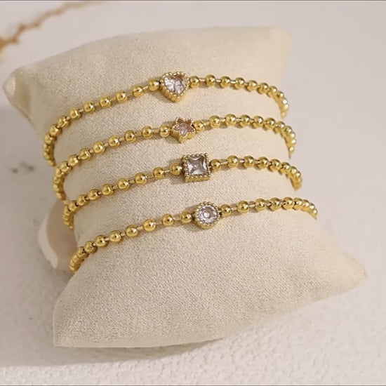 18K Gold Plated Titanium Steel Fashion Layered Small Gold Bead Chain Bracelet Set – Simple Geometric Designs with Crystal Inlays, Heart and Star Pendants