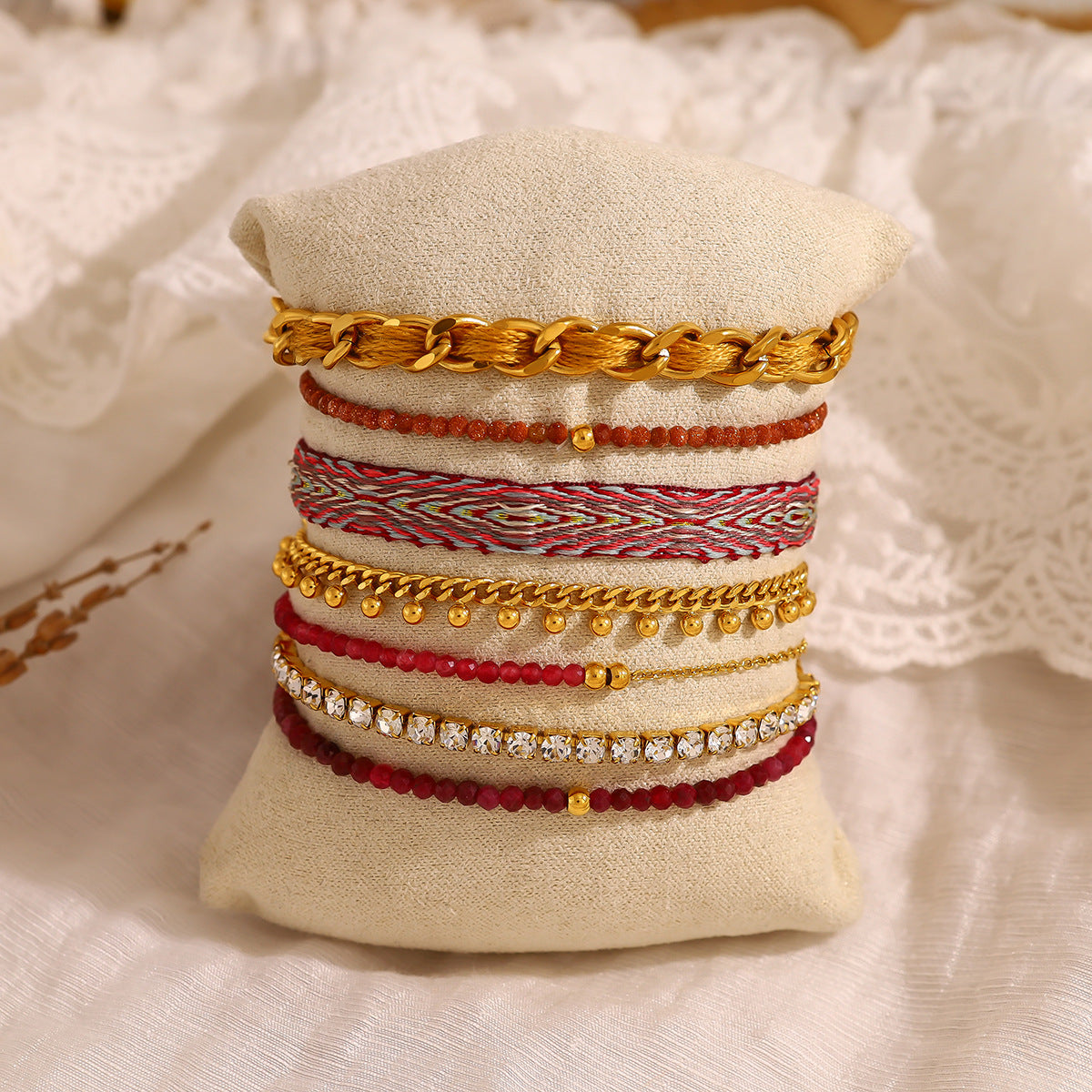 This collection features six unique designs, blending crystal beads, amethyst, gold sandstone, and polished stainless steel chains to create a refined multi-layer texture that complements any outfit.