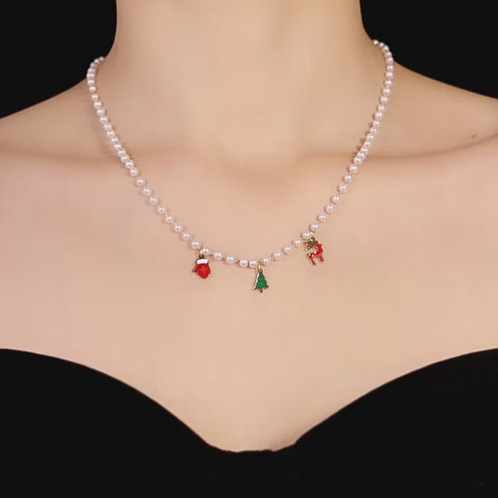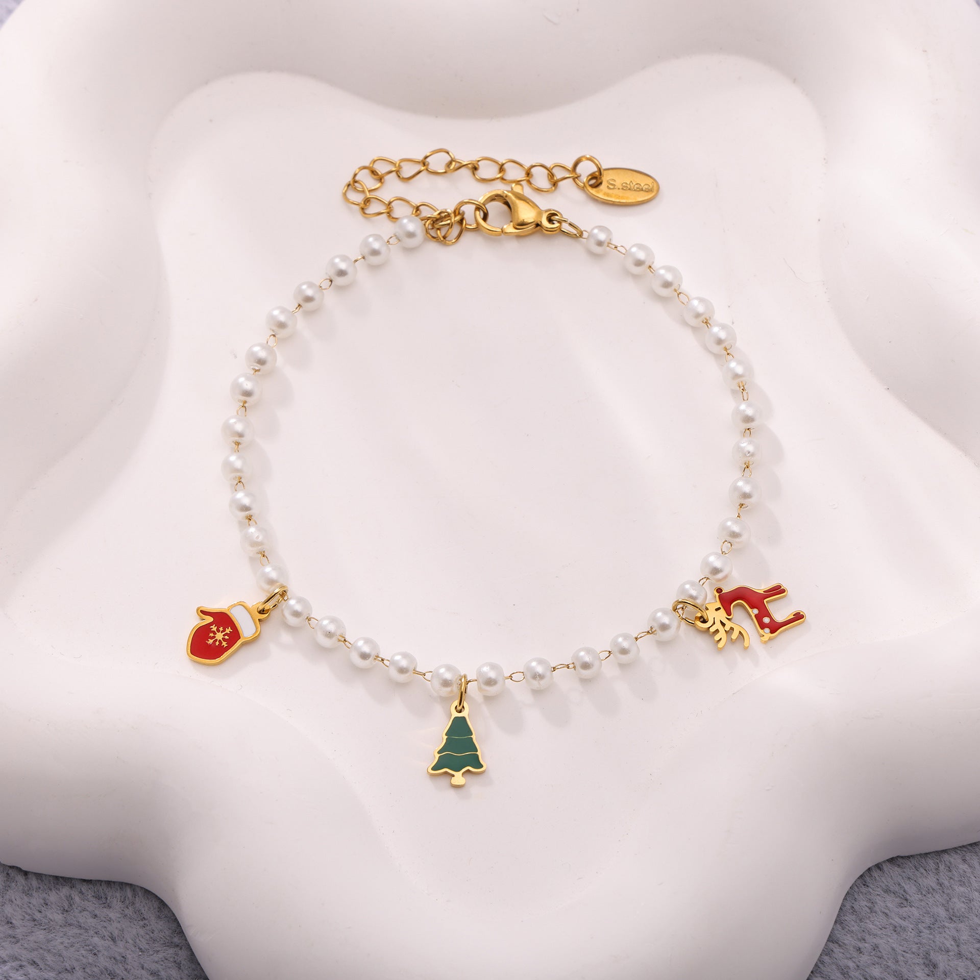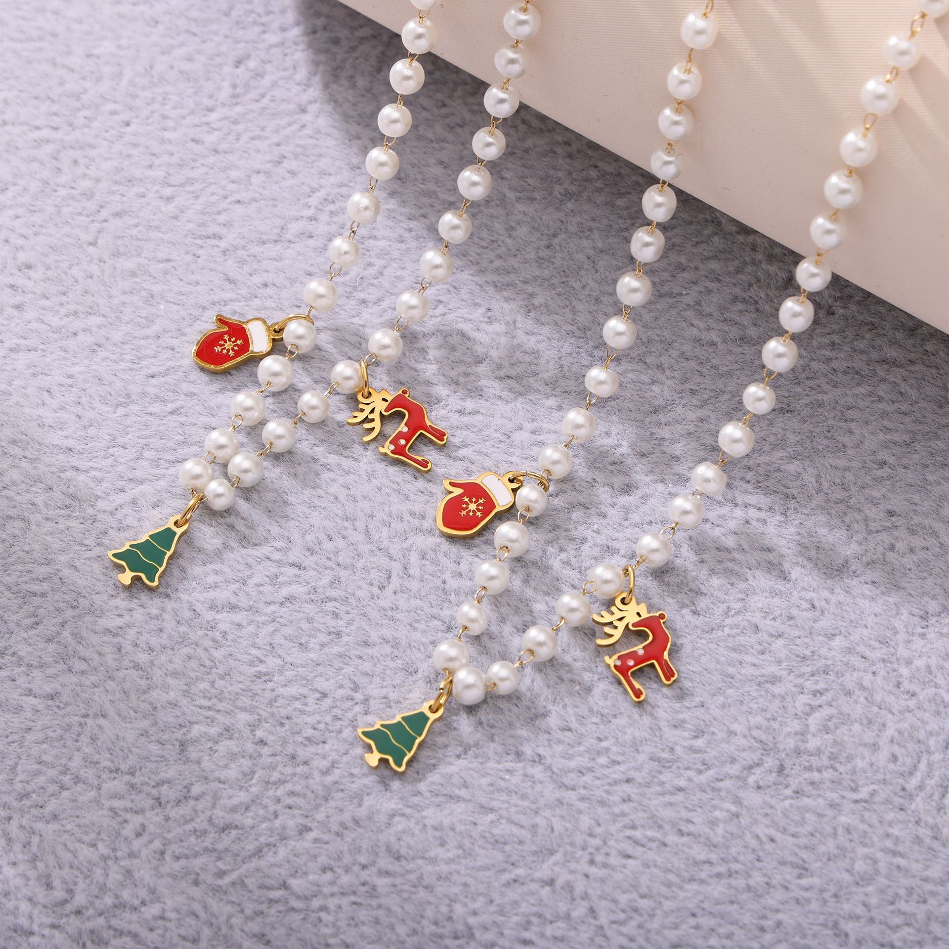 Celebrate the festive season with this elegant Christmas jewelry set featuring a gold-plated stainless steel necklace and bracelet with reindeer, glove, and Christmas tree pendants. The imitation pearls and glossy enamel details bring a touch of warmth and sparkle to your holiday looks.