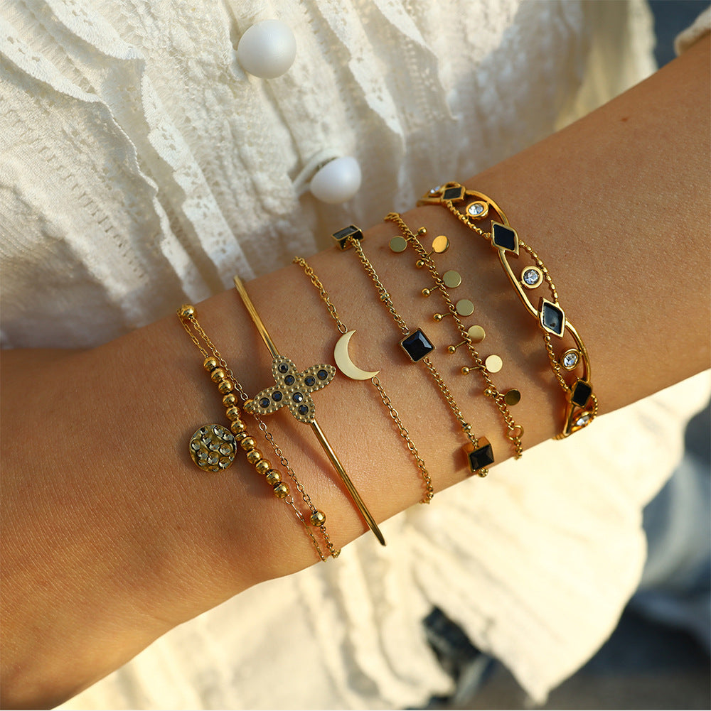 18K Gold Plated Titanium Steel Crystal Moon & Cross Pendant Bracelet | Elegant Fashion Jewelry