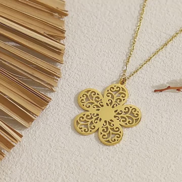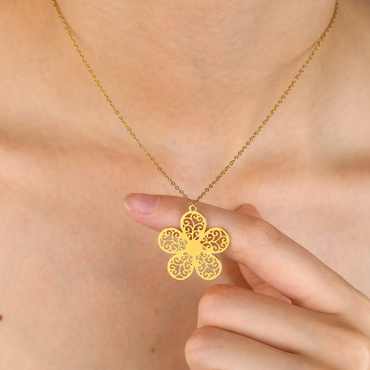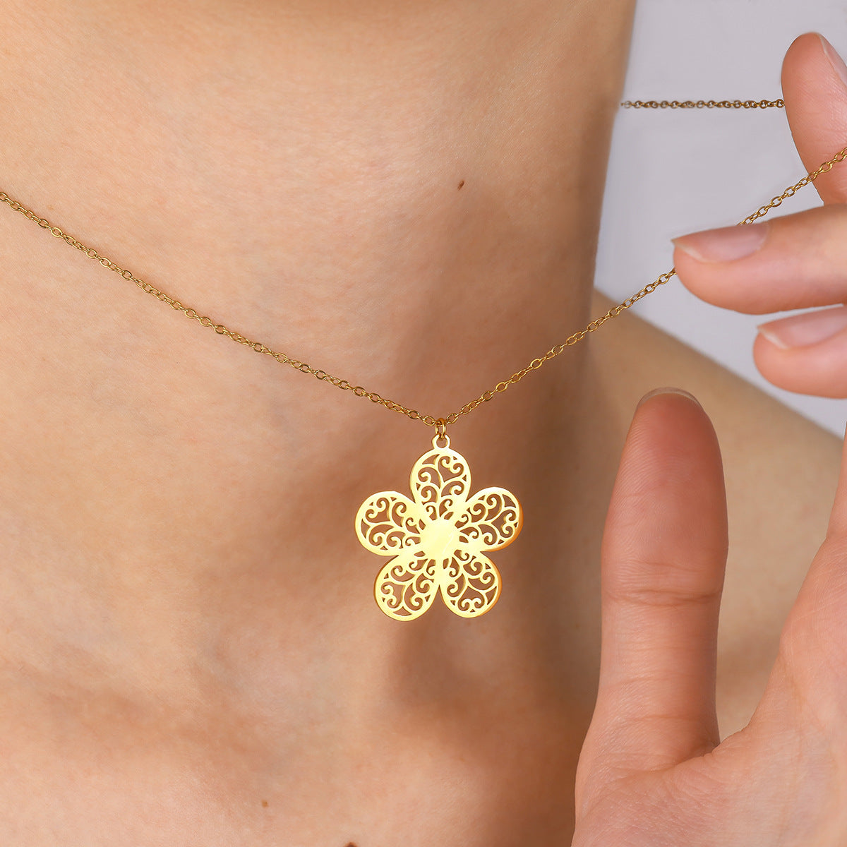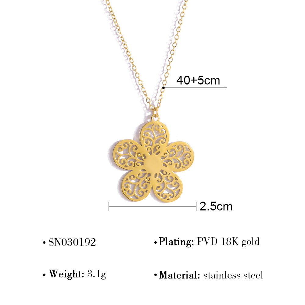 This stylish stainless steel hollow floral pattern clavicle necklace is the perfect choice for your daily wear. Made from 18K gold-colored titanium steel, it is light and durable. The design is inspired by the flower shape found in nature, with the hollow floral texture showcasing a unique elegance while adding a modern touch. Suitable for daily commuting or minimalist style matching. The chain length is 40+5cm, fitting most neck sizes with an adjustable chain for added comfort. Whether worn alone or paired with other jewelry, it enhances your refined taste.