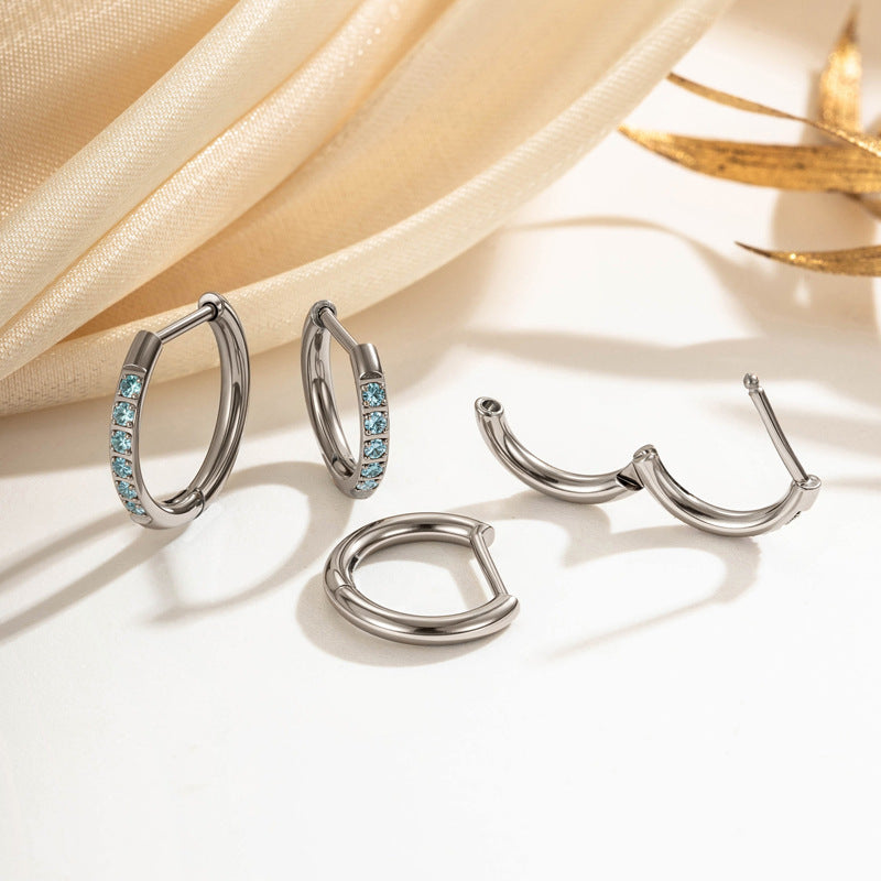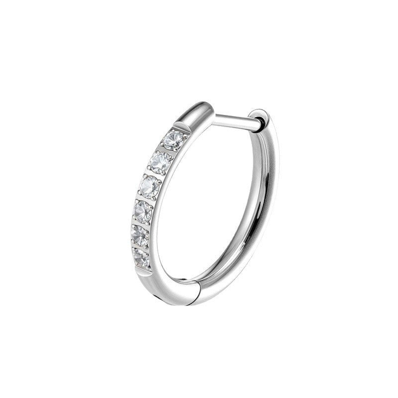 This titanium hoop earring is designed to blend classic beauty with modern piercing aesthetics. The micro-paved CZ stones catch light at every angle, while the titanium base ensures comfort even for sensitive skin.