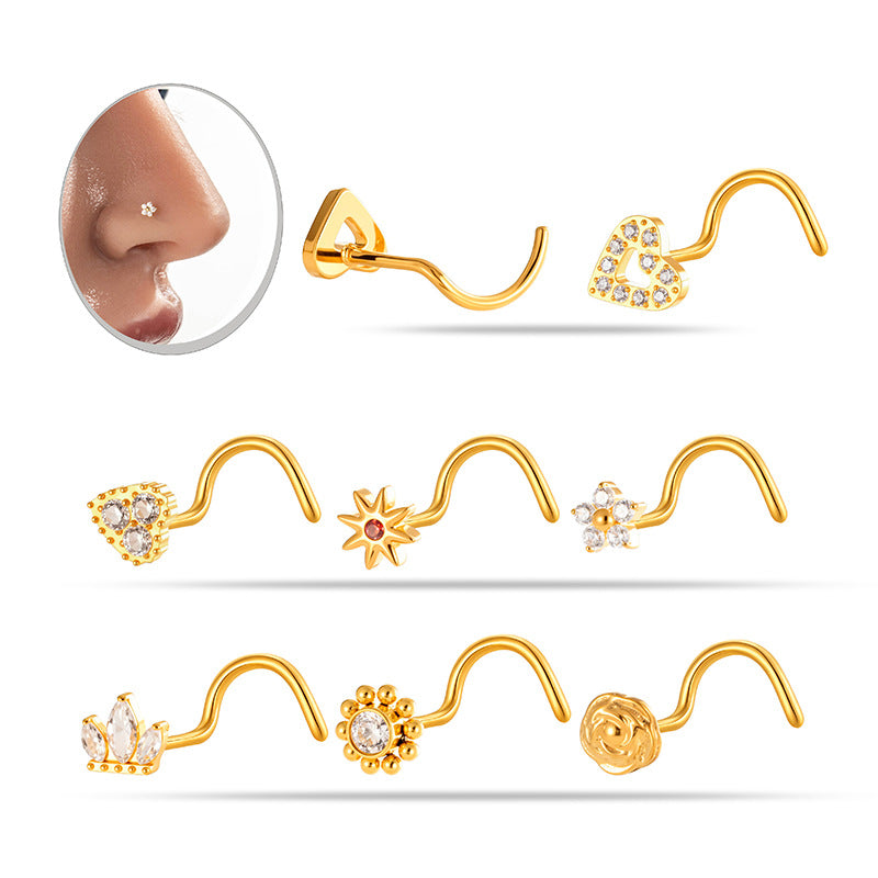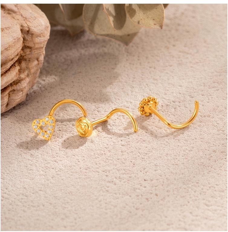 G23/F136 Titanium S-Bar Nose Stud Zircon Paved Hollow Heart & Rose Design – Hypoallergenic Nose Piercing Jewelry for Women, Gold & Silver