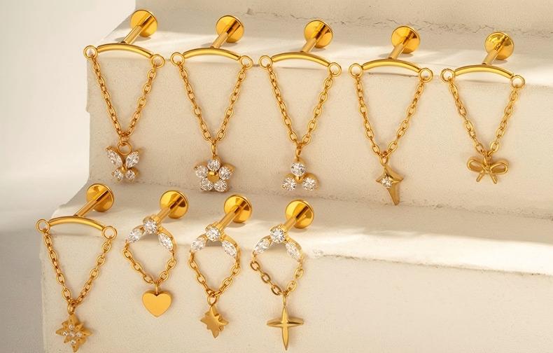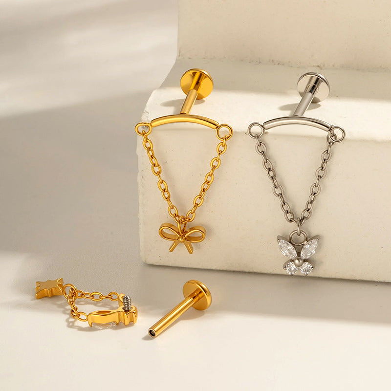 G23 Titanium Piercing with Butterfly, Heart, Star, and Chain Zircon Pendants – Threaded Flat-Top Lip & Cartilage Piercing Earring Jewelry