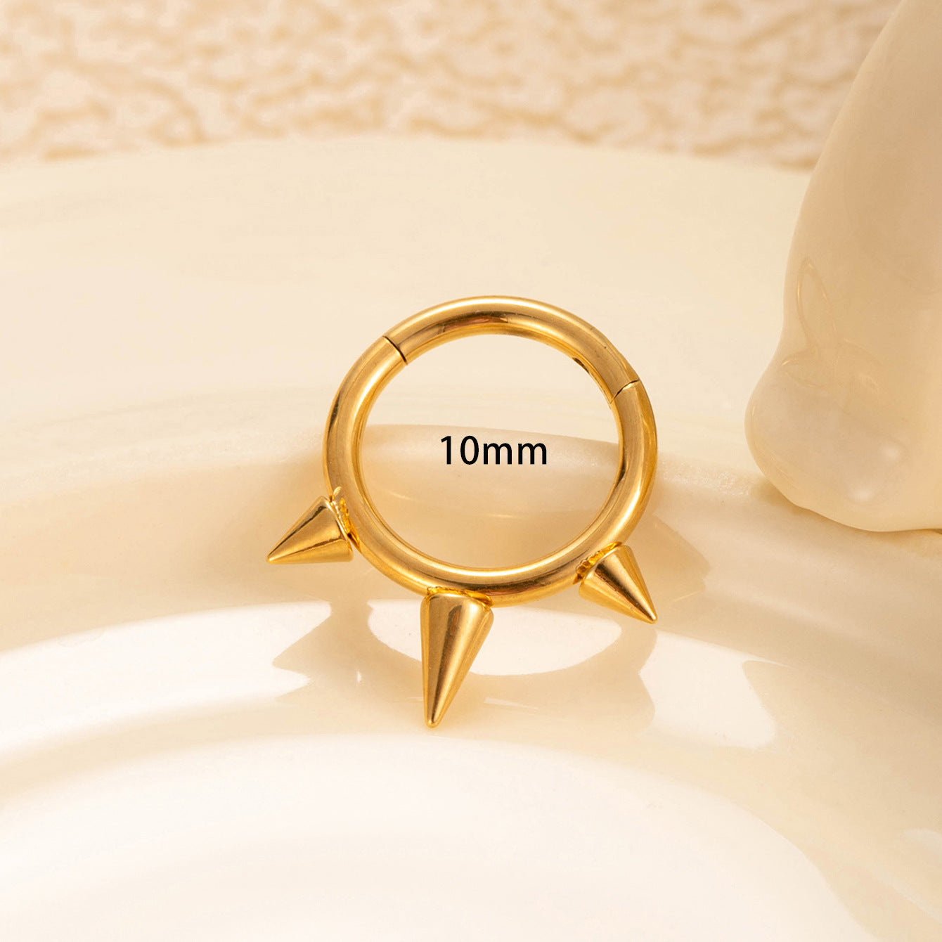 Featuring a sharp cone spike silhouette and a smooth hinged clicker closure, this earring offers both modern aesthetics and long-lasting comfort.
