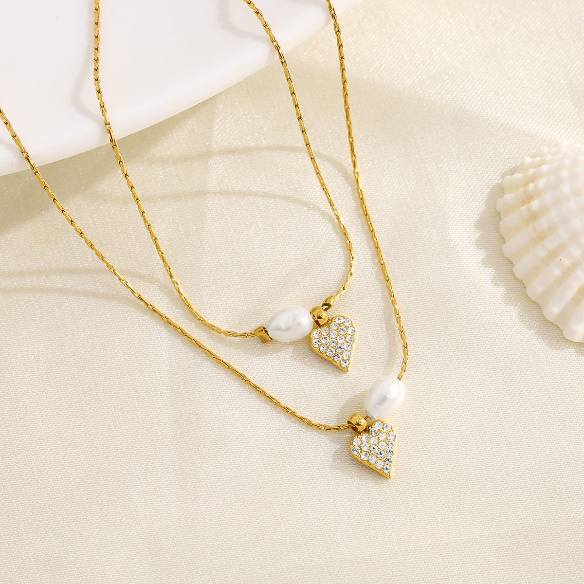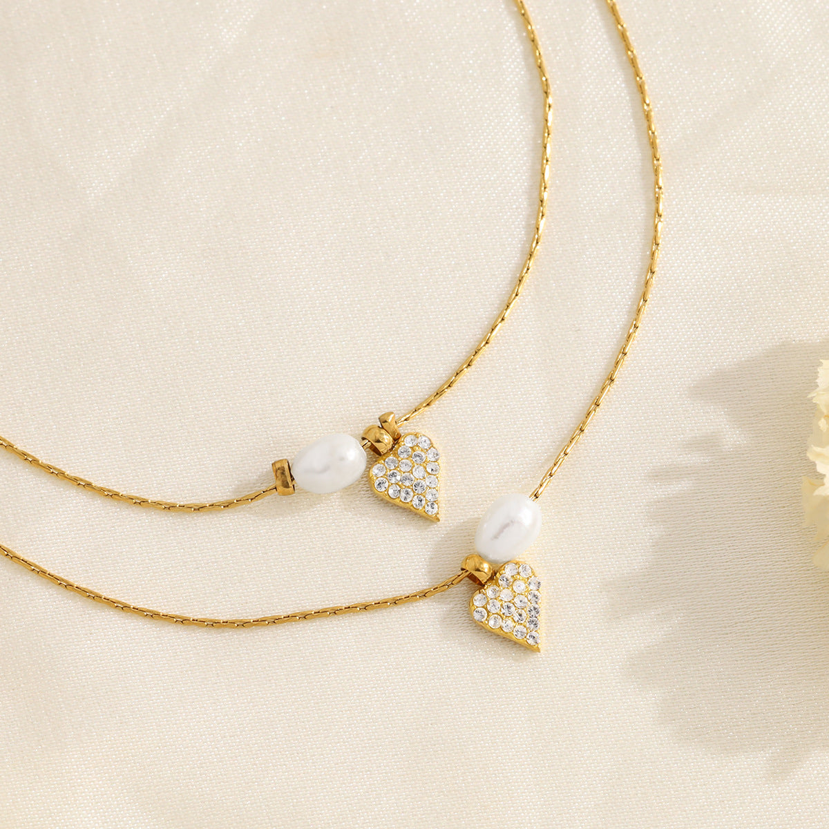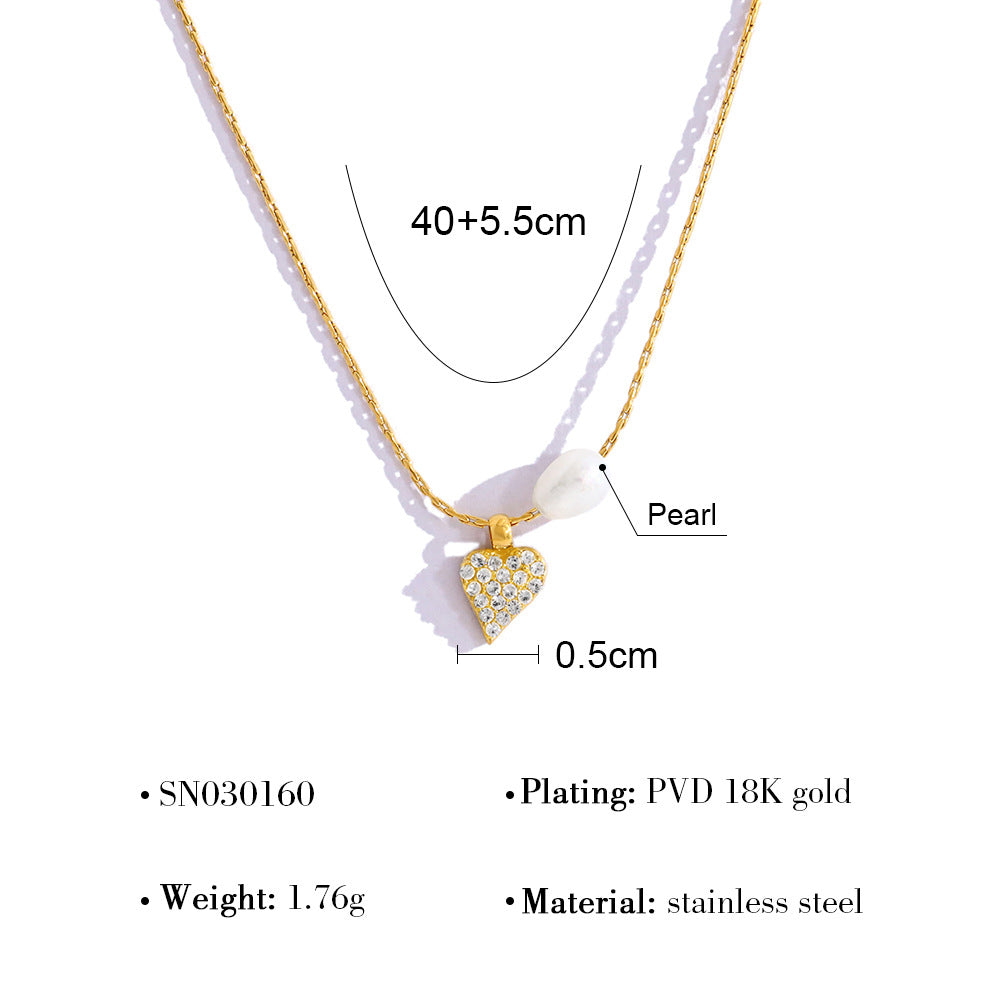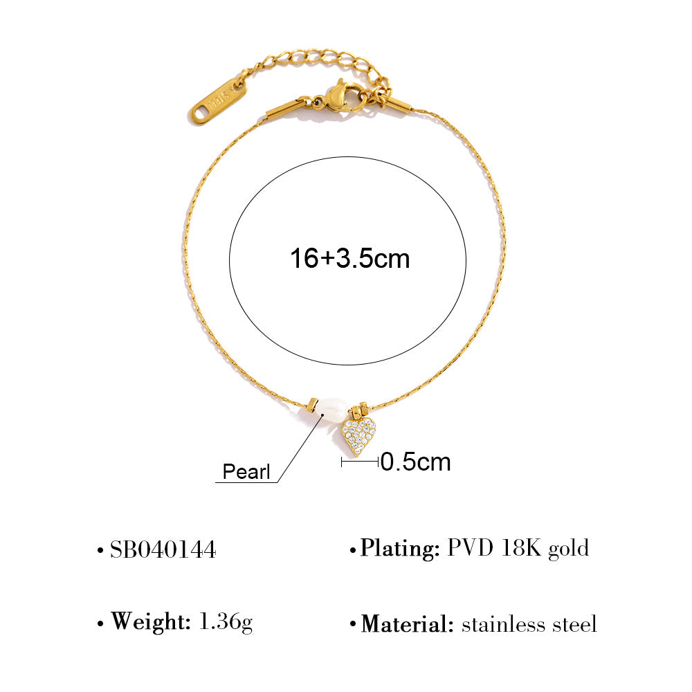 Elegant Pearl & Diamond Heart Pendant Titanium Steel Necklace & Bracelet Set – 18K Gold Plated, Adjustable Length, Perfect for Gifts