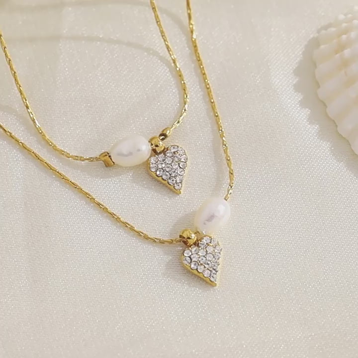 This stunning Pearl & Diamond Heart Pendant Necklace and Bracelet Set is a perfect choice for those who love elegant, timeless designs. Crafted with high-quality 316L Titanium Steel and plated with 18K Gold, this set includes a bracelet and a necklace, each adorned with a beautiful heart-shaped pendant featuring sparkling zirconia and pearls.