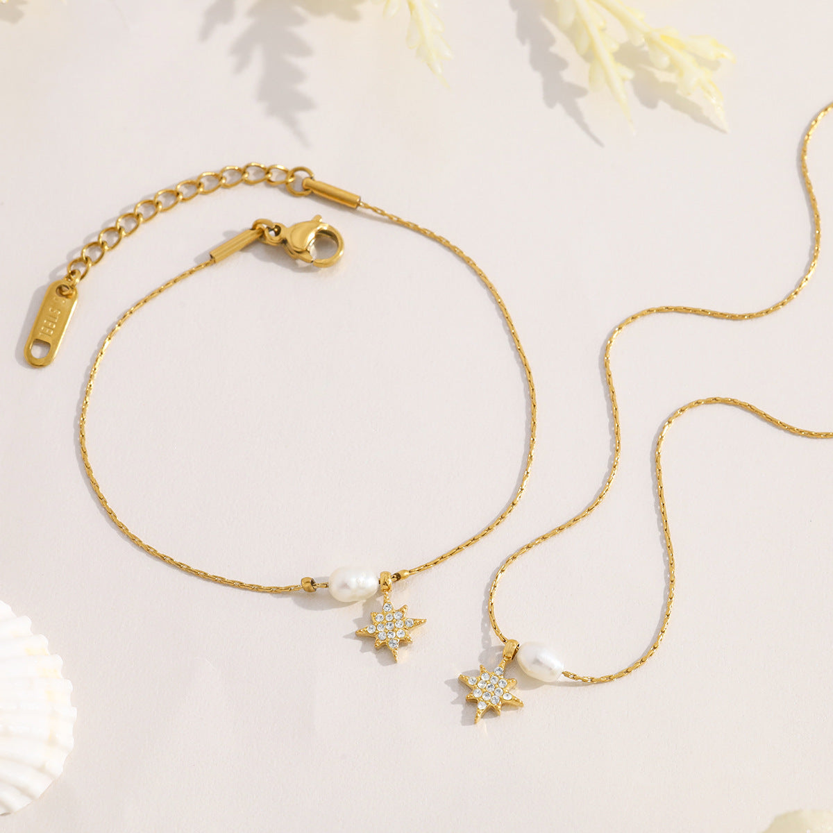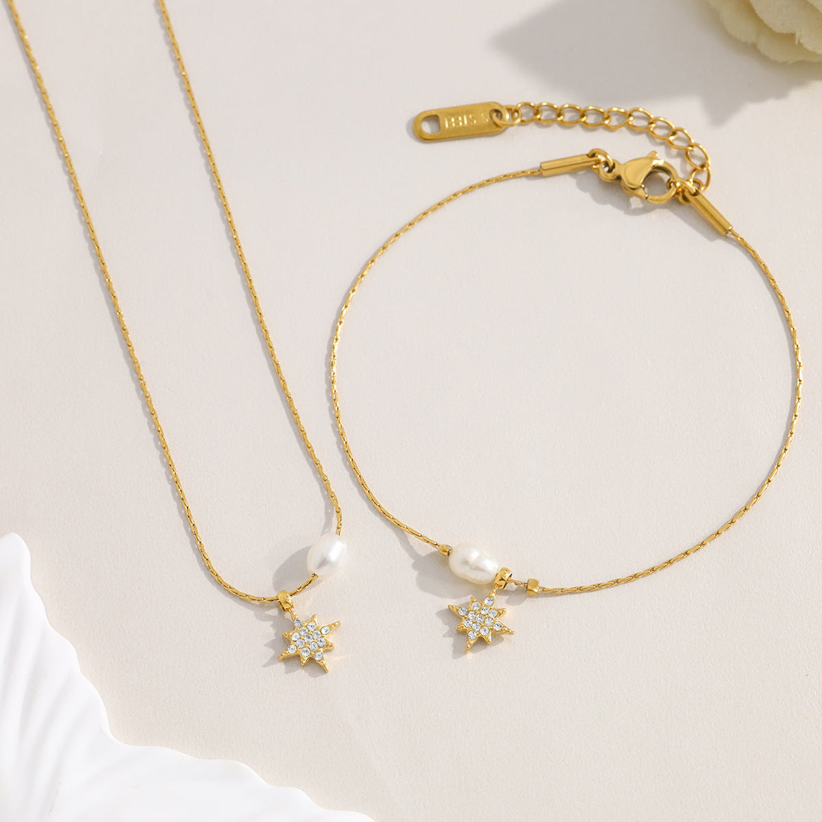 Elegant Pearl & Star Pendant Titanium Steel Necklace and Bracelet Set | Fashion Jewelry Set