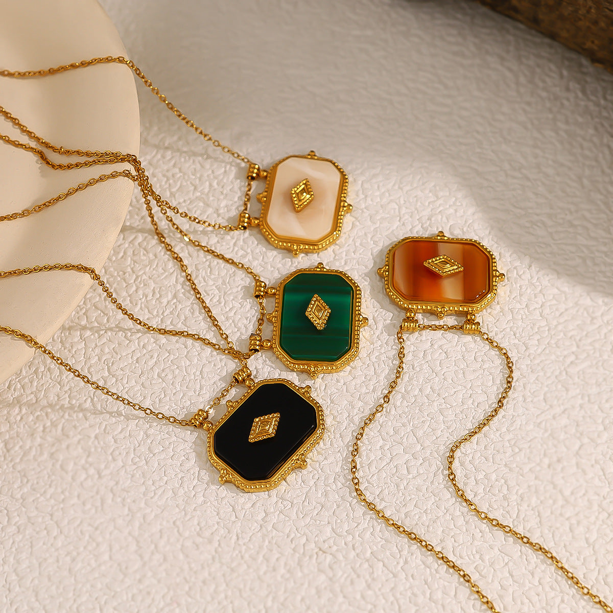 This Rectangular Pendant Necklace Set features a sleek, modern design perfect for any occasion. Available in black, brown, green, and white, this necklace combines 18K gold-plated titanium steel with high-quality acrylic and malachite materials. Whether you’re looking to elevate your everyday wear or accessorize for a special event, this piece is both versatile and stylish.