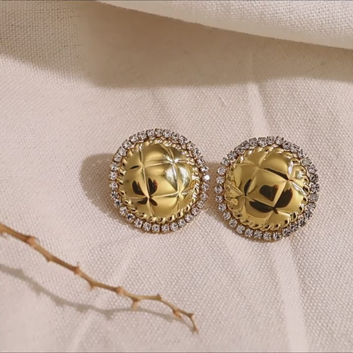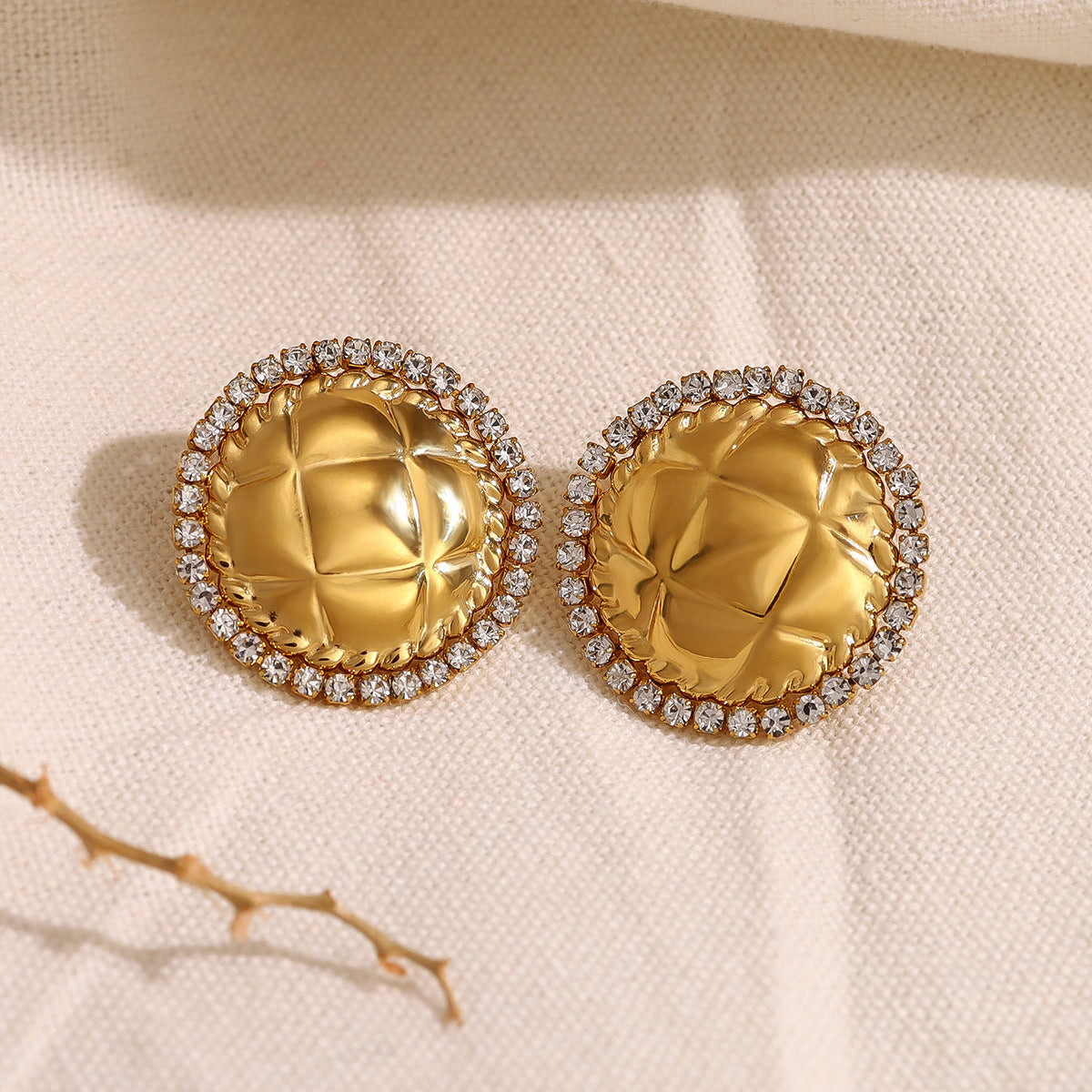Perfect for gifting, parties, or upgrading your jewelry essentials Parameter Description Product Model SE010336 Material Stainless Steel, Crystal Color Gold Style Geometric Round Earrings Weight 10g Size 2.6cm × 2.6cm Design Diamond-textured with embedded crystal Features Hypoallergenic, Tarnish-resistant, Lightweight Occasion Daily wear, Date night, Party, Gift, Business wear
